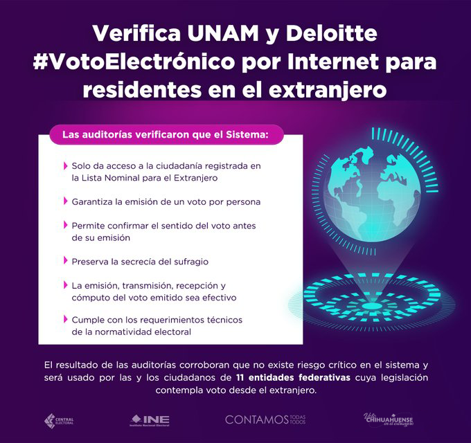 La ley ordena al INE contar con el dictamen de al menos dos empresas de prestigio internacional que certifiquen la funcionalidad del sistema, por lo que se cuenta con los dictámenes de las auditorías realizadas por la UNAM y la empresa Deloitt, que, junto con dos simulacros, permiten concluir que el sistema de voto electrónico por Internet para residentes en el extranjero cuenta con los elementos necesarios para llevar a cabo los procesos con un nivel de seguridad adecuado y las garantías de efectividad, secrecía y certeza.